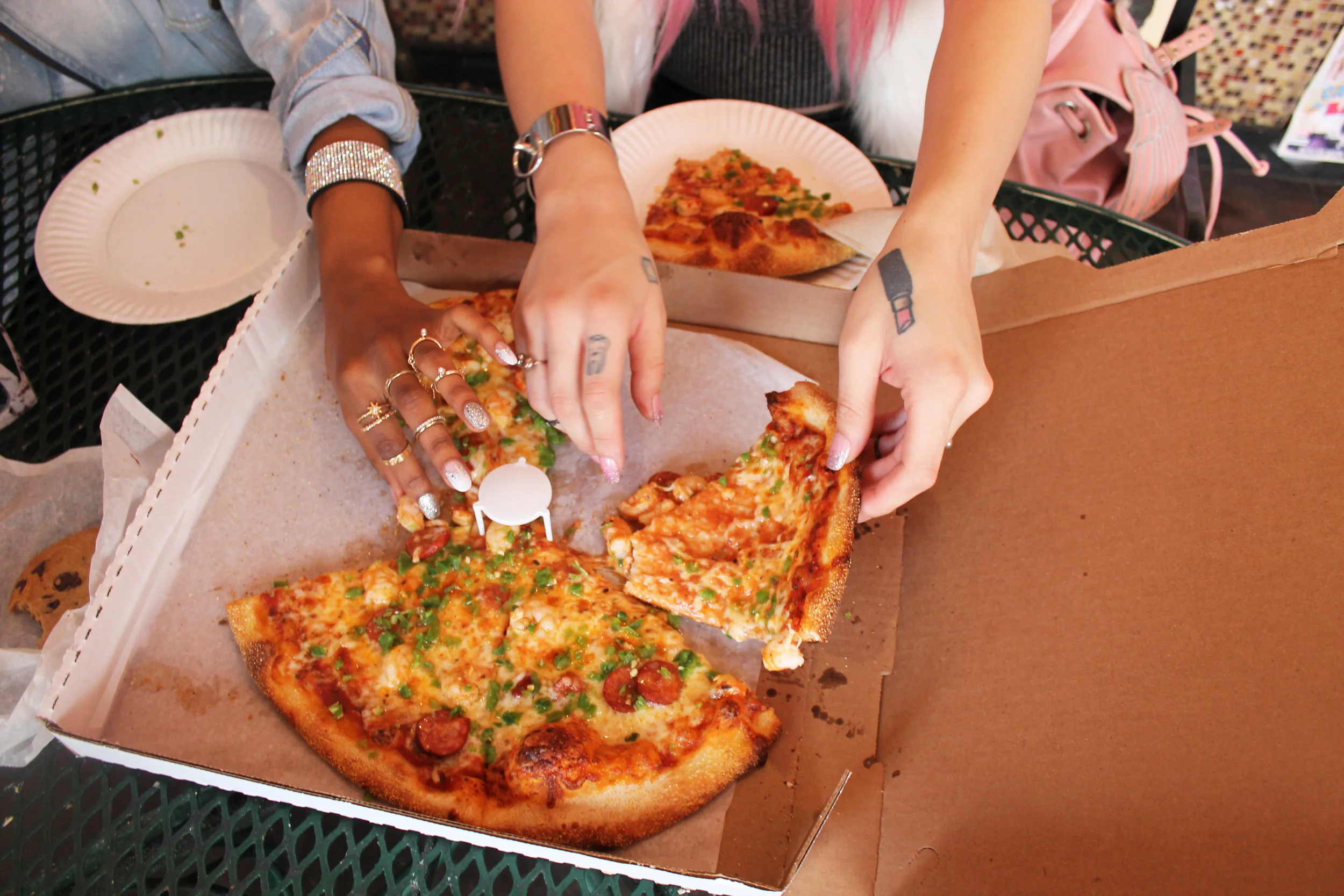 After eating two XL pizzas, four cookies, a dozen macaroons, countless soda, and a single lemon water, we found out what happens at the fifth hour of the Pizza Cleanse™: you get really sleepy, kind of sick, and your models have permanent grease stains on their finger tips. (Pizza grease french manicures, top trend of 2017, calling it now.) So maybe there is a limit to how much pizza you should eat in one day. Probably not, but maybe. Either way, if anyone ever tries to tell you how to manage your own body, feel free to recommend this Pizza Cleanse™ before blocking them from all social channels because you absolutely don't need that energy in your life. Time is money, money is pizza, pizza is happiness.